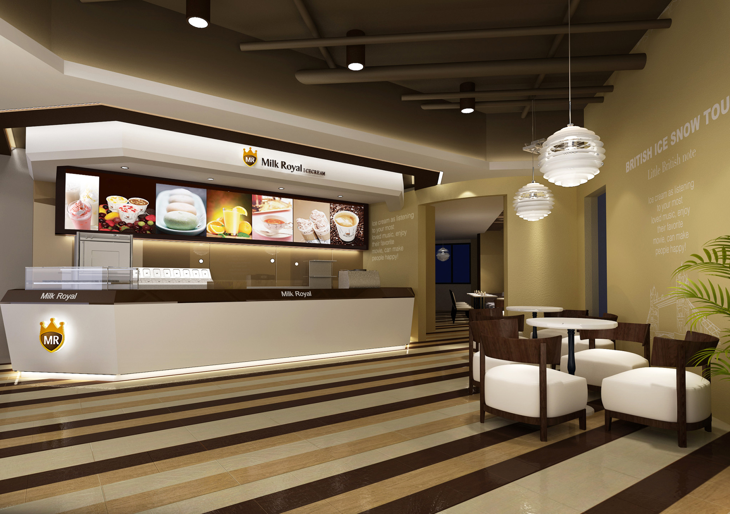 Milk Royal 冰淇淋的空間設計采用經典的板式、柱式造型,強調細節裝飾效果,弧形金屬線框起到了貫穿系統的作用。色彩上以深棕搭配金色,高貴大氣,盡顯英式古典風范。